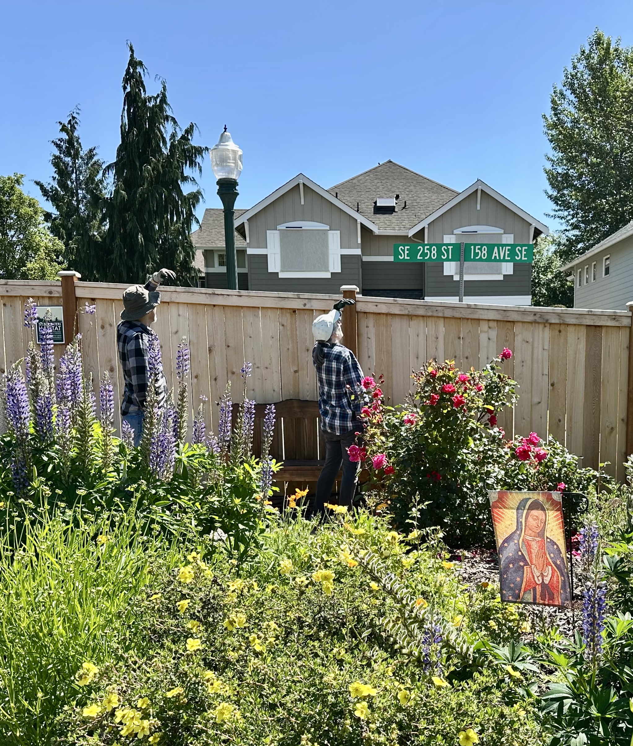 Take lupine (Lupinus), for example—gorgeous in bloom with its purple flower spikes, like the one you’ll see in front of Emilio in the “eagles” photo. While stunning, it’s become a bit of a problem child. Since being planted in 2022, it has quietly spread by seed to other parts of the garden. Just this week, we removed and bagged as many of its seed pod stalks as possible to keep it from taking over.