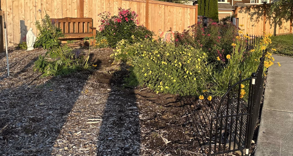 Another surprise came from a 2023 pollinator seed packet that included Chinese forget-me-nots—which we’ve since learned are invasive—and tickseed (Coreopsis). Though cheerful and bright, the tall yellow tickseed has taken to flopping over and smothering our other plants. You’ll see the cleared pile to the right of the bench in the latest photos.